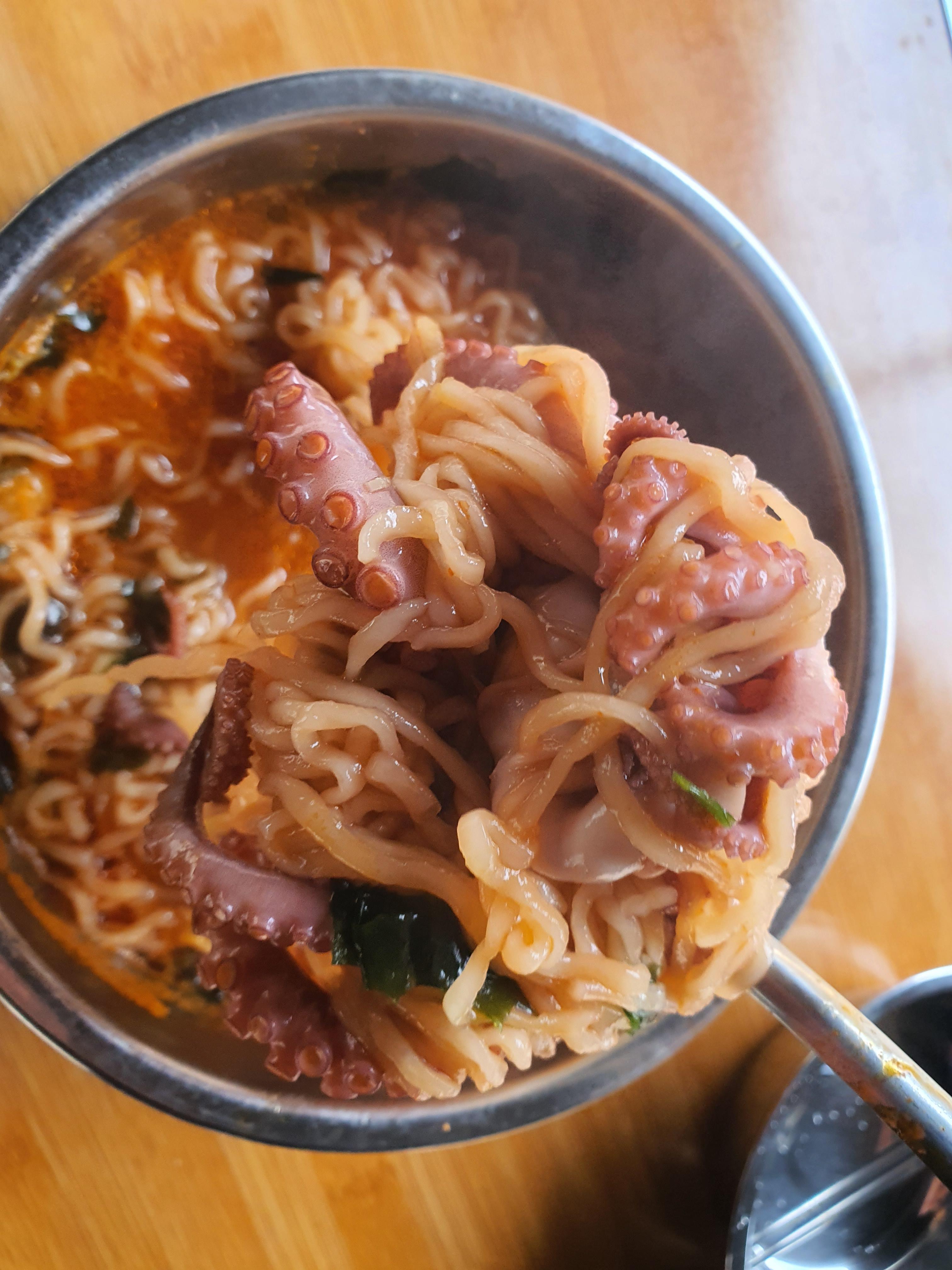 낚지 5마리 넣어서 끊었더니 라면색이 약간 보라색으로 물들어졌는데 면발이 더 탱글탱글 해지고 맛도 더 좋아졌습니다