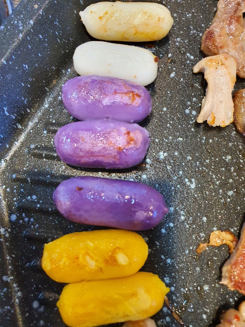 탄수화물 밥 안 먹는 대신에 이쁜 색감을 가지고 있는 노랑 떡 흰색 떡 보라색 떡 하나하나 안에 들어 있는 게 흰색 꺾은 안에 치즈가 들어 있어서 고소하고 달아요