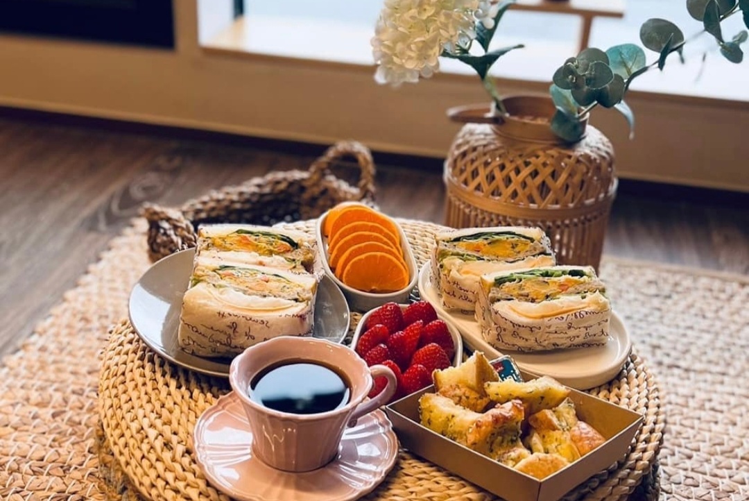 따스한 아메리카노 한잔과 어울리는 샌드위치와 과일~