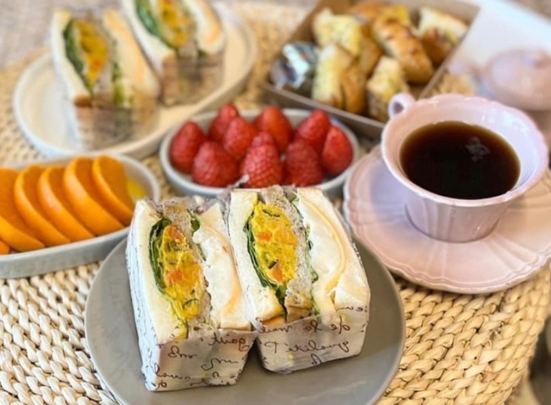따스한 아메리카노 한잔과 어울리는 샌드위치와 과일~