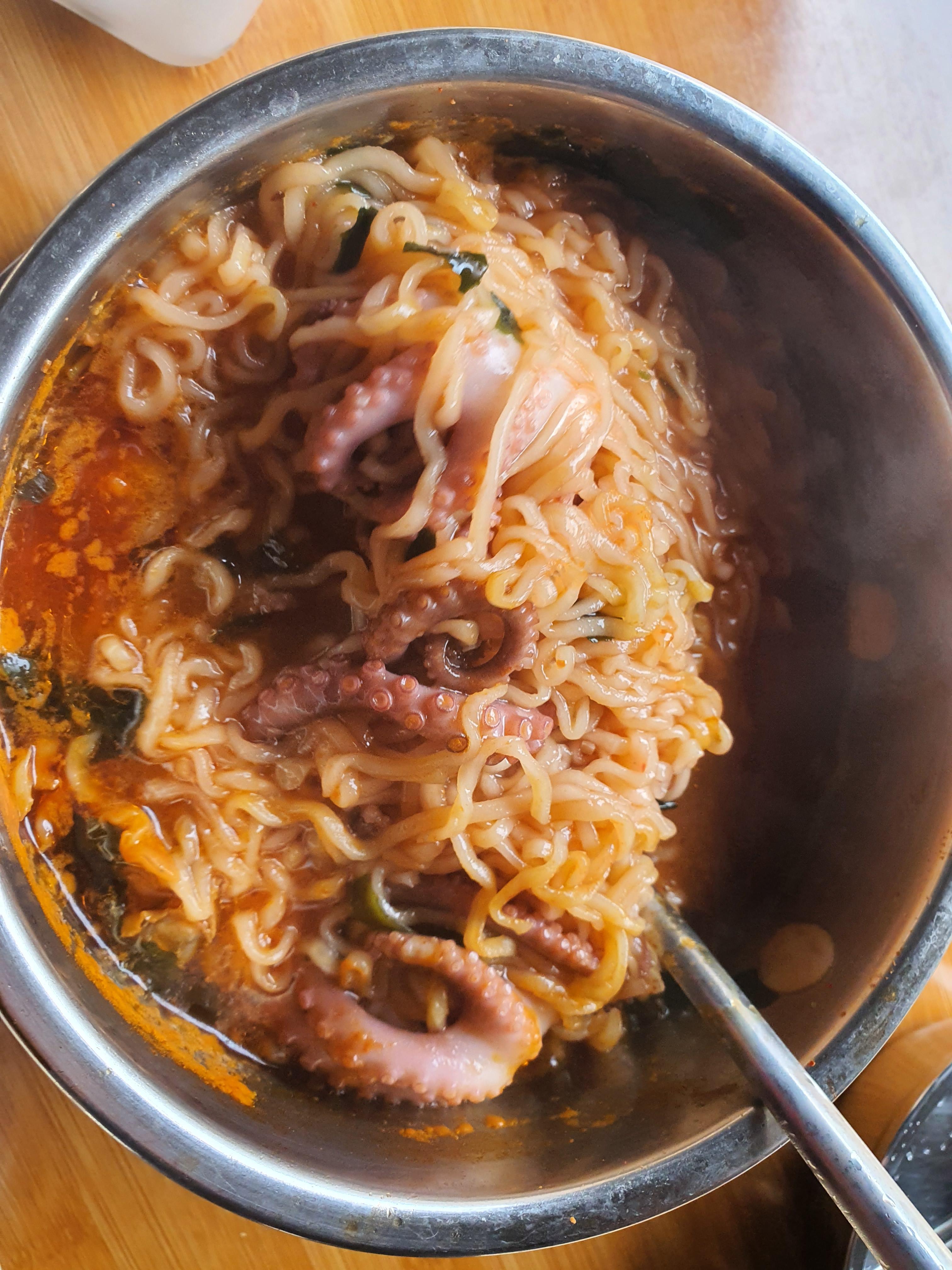 낚지 5마리 넣어서 끊었더니 라면색이 약간 보라색으로 물들어졌는데 면발이 더 탱글탱글 해지고 맛도 더 좋아졌습니다