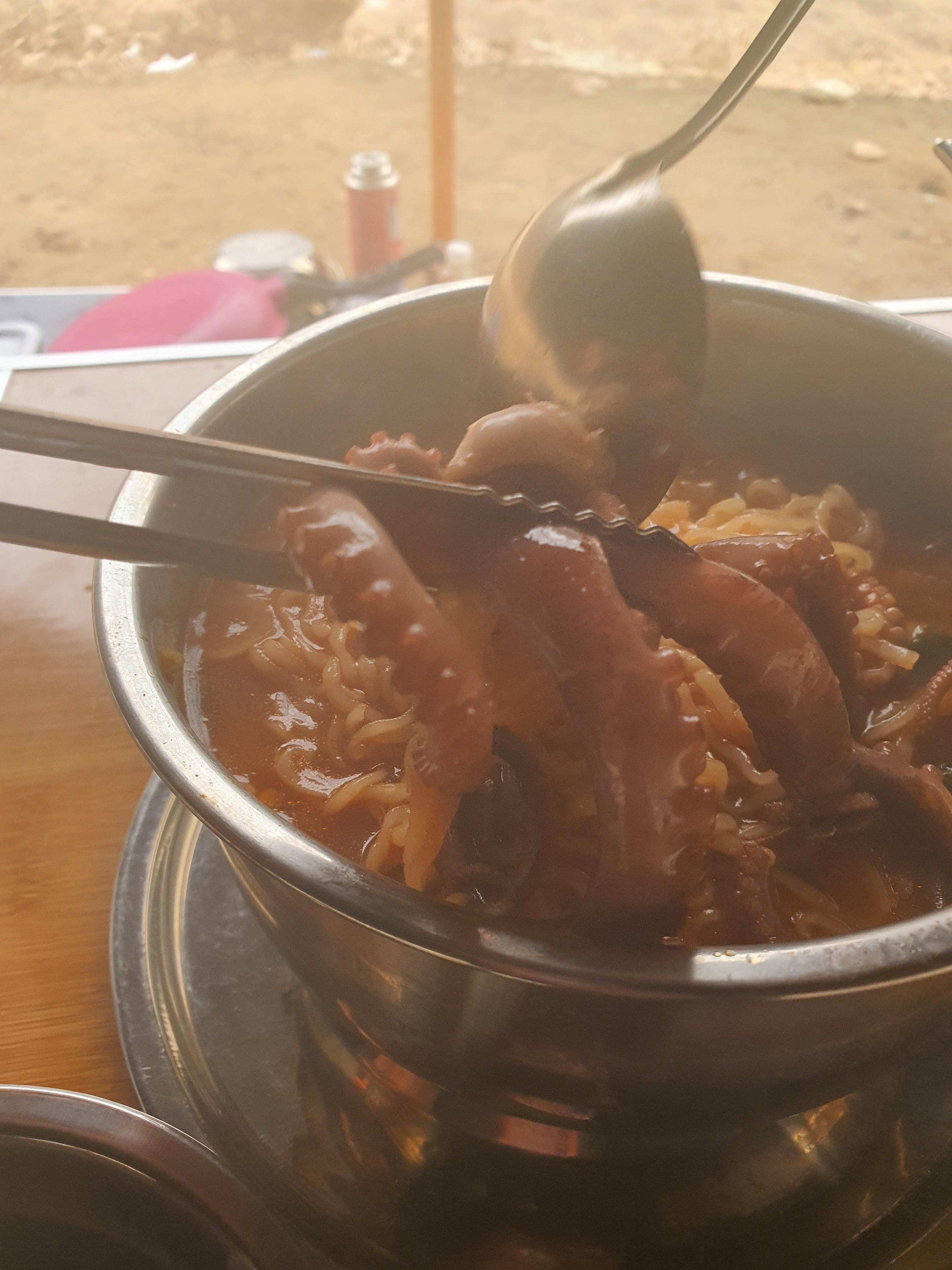 강원도 홍천 보리울캠핑장에서 낚지라면 끓여서 먹었는데 꿀맛이었습니다