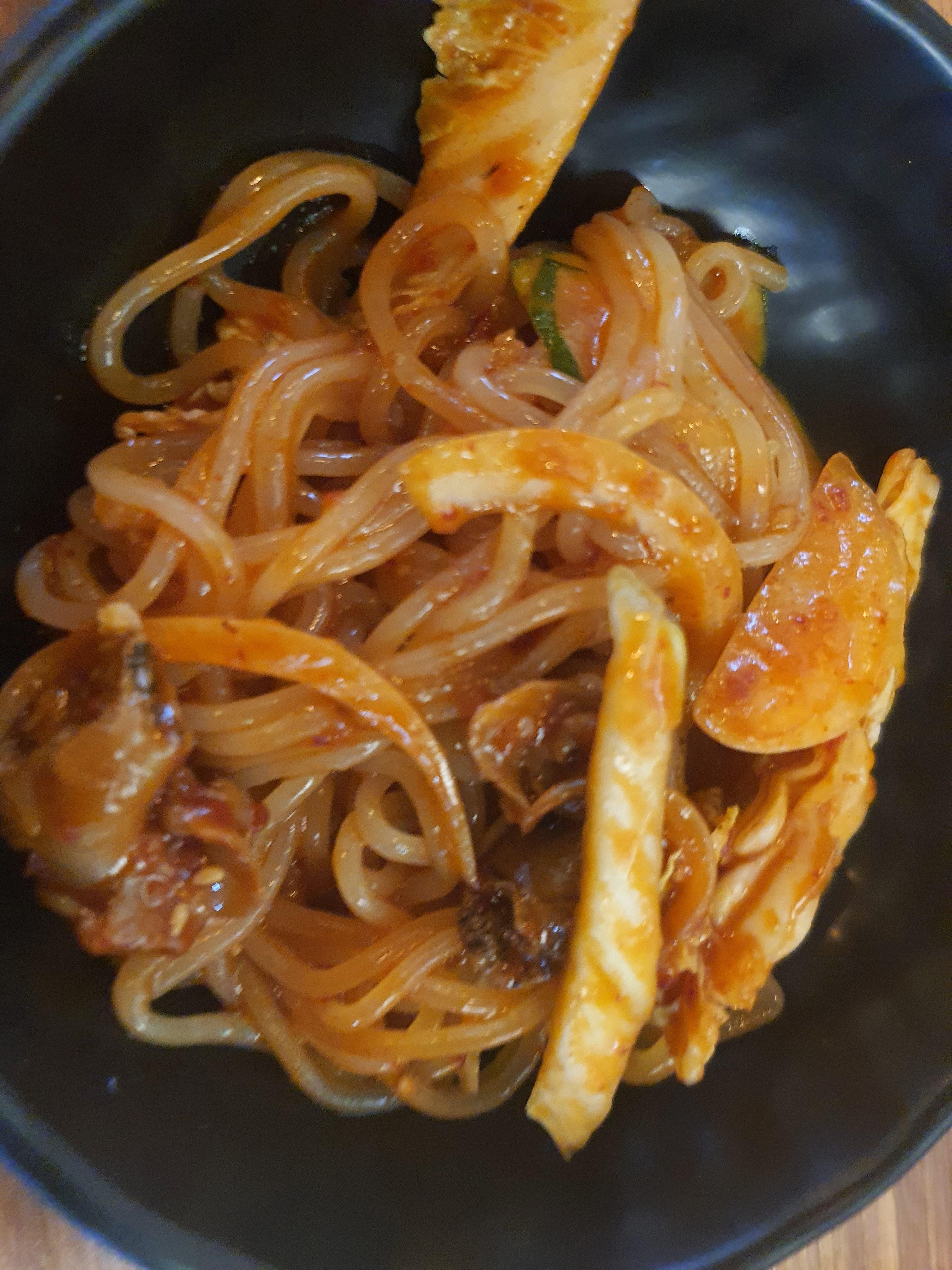 밥 대신 면으로 새콤달콤한 골뱅이무침 안에 쫄면 면이 들어가 있어서 두 가지 음식 맛을 볼 수 있는 느낌이랄까