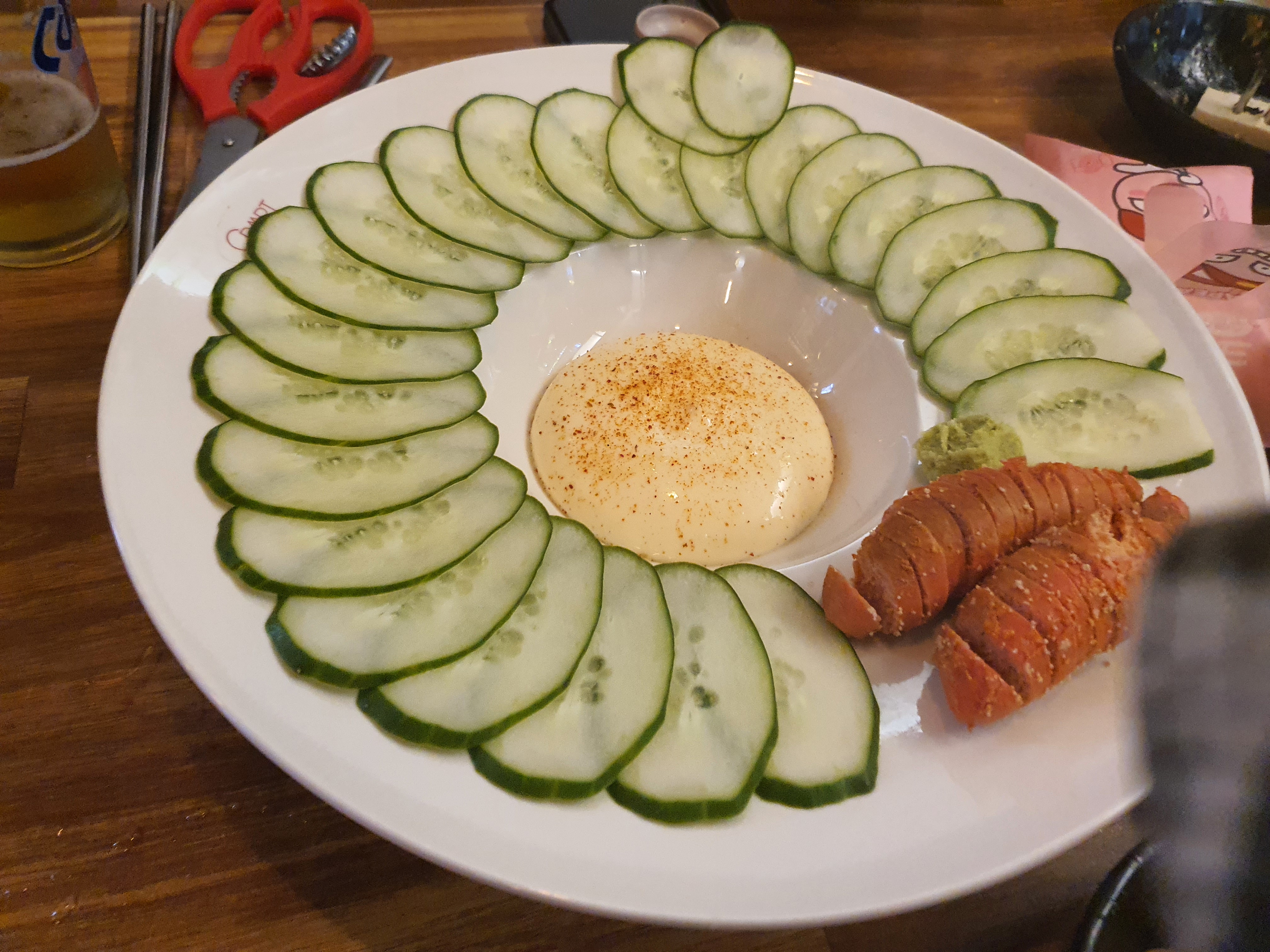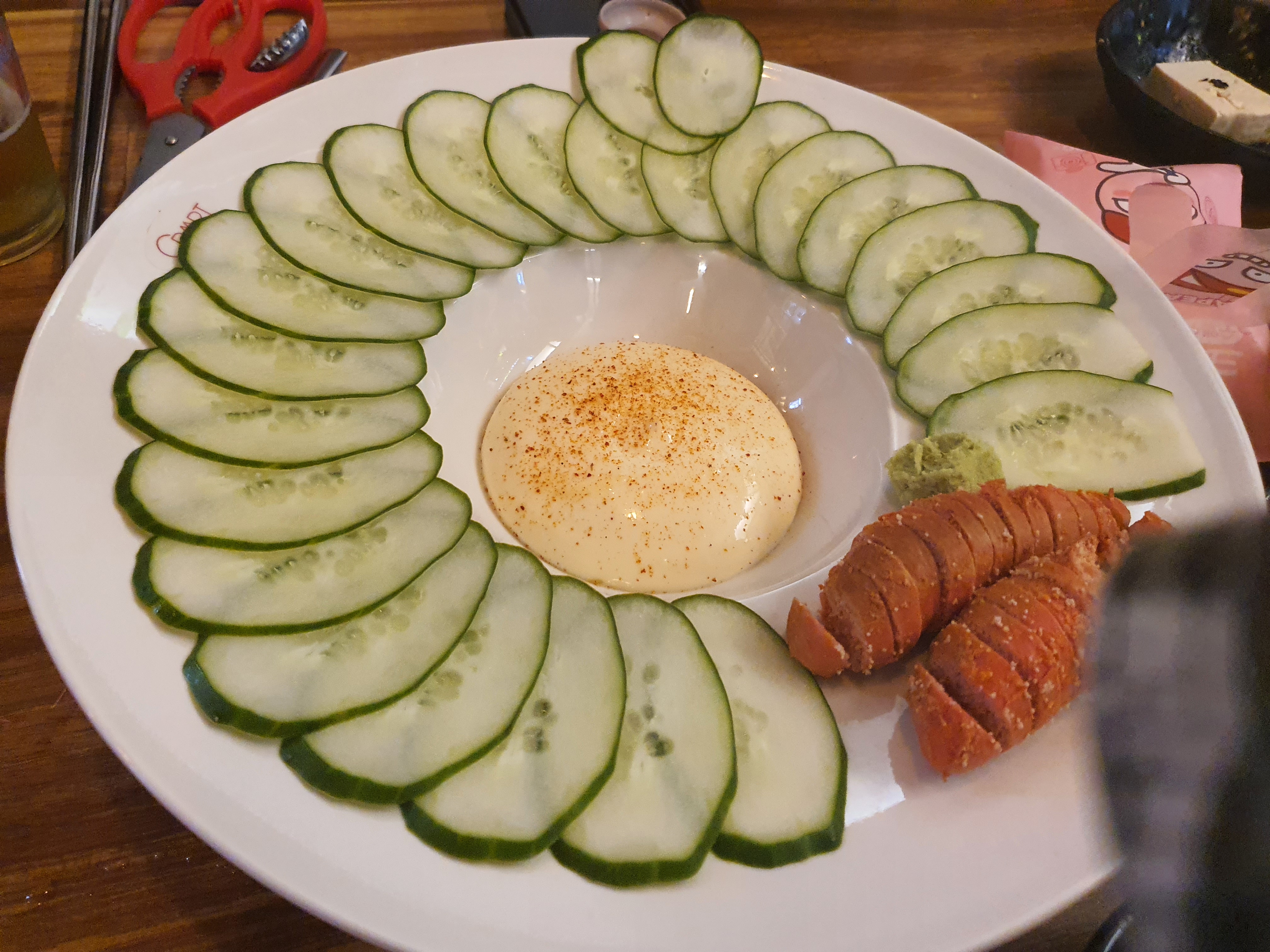 마무리로 오이와 소시지 소스가 맛있는 이것은 짭조름한 소시지와 상큼한 오이가 잘 어울렸으며 소스가 한몫했습니다