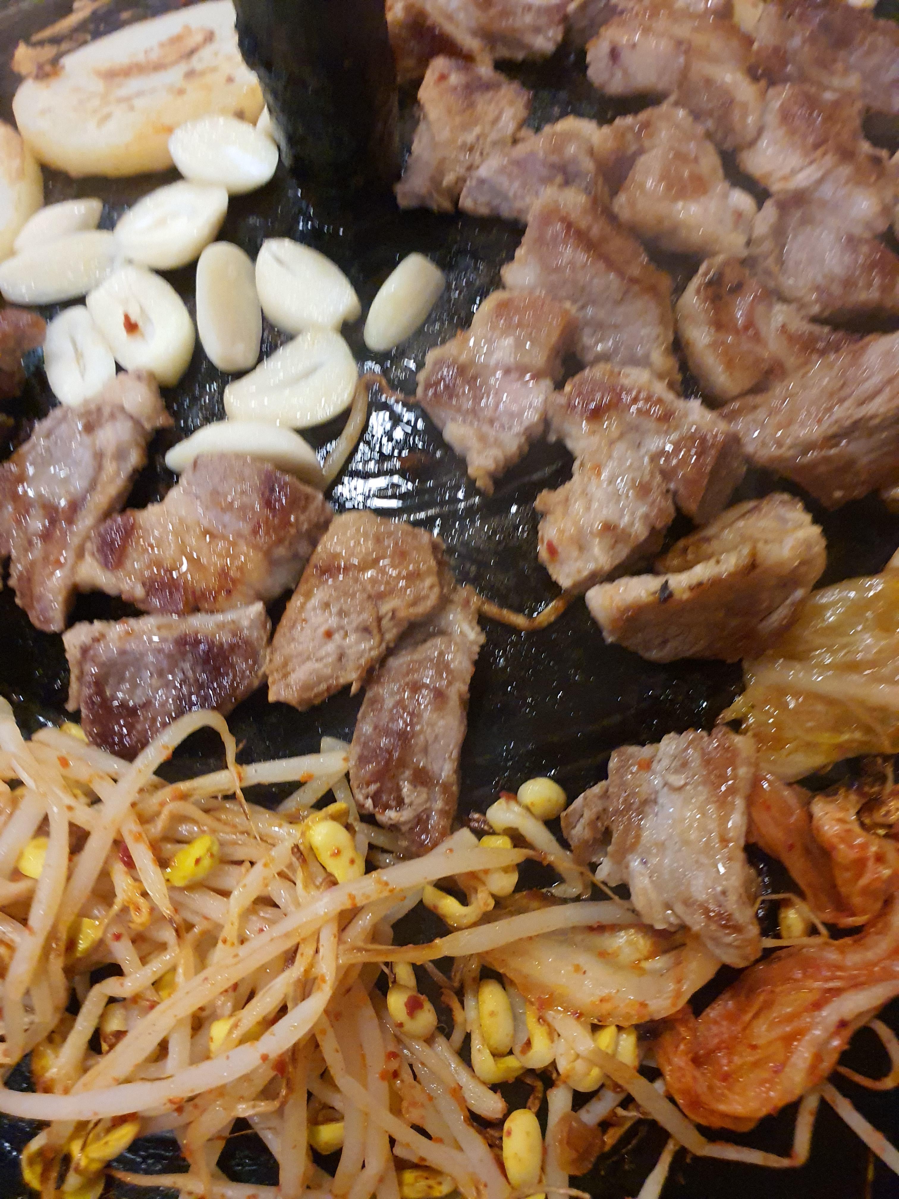점심이지만 점심은 솥뚜껑 위에 지글지글 목살을 구워서 김치와 콩나물까지 먹으면 정말 꿀맛이랍니다