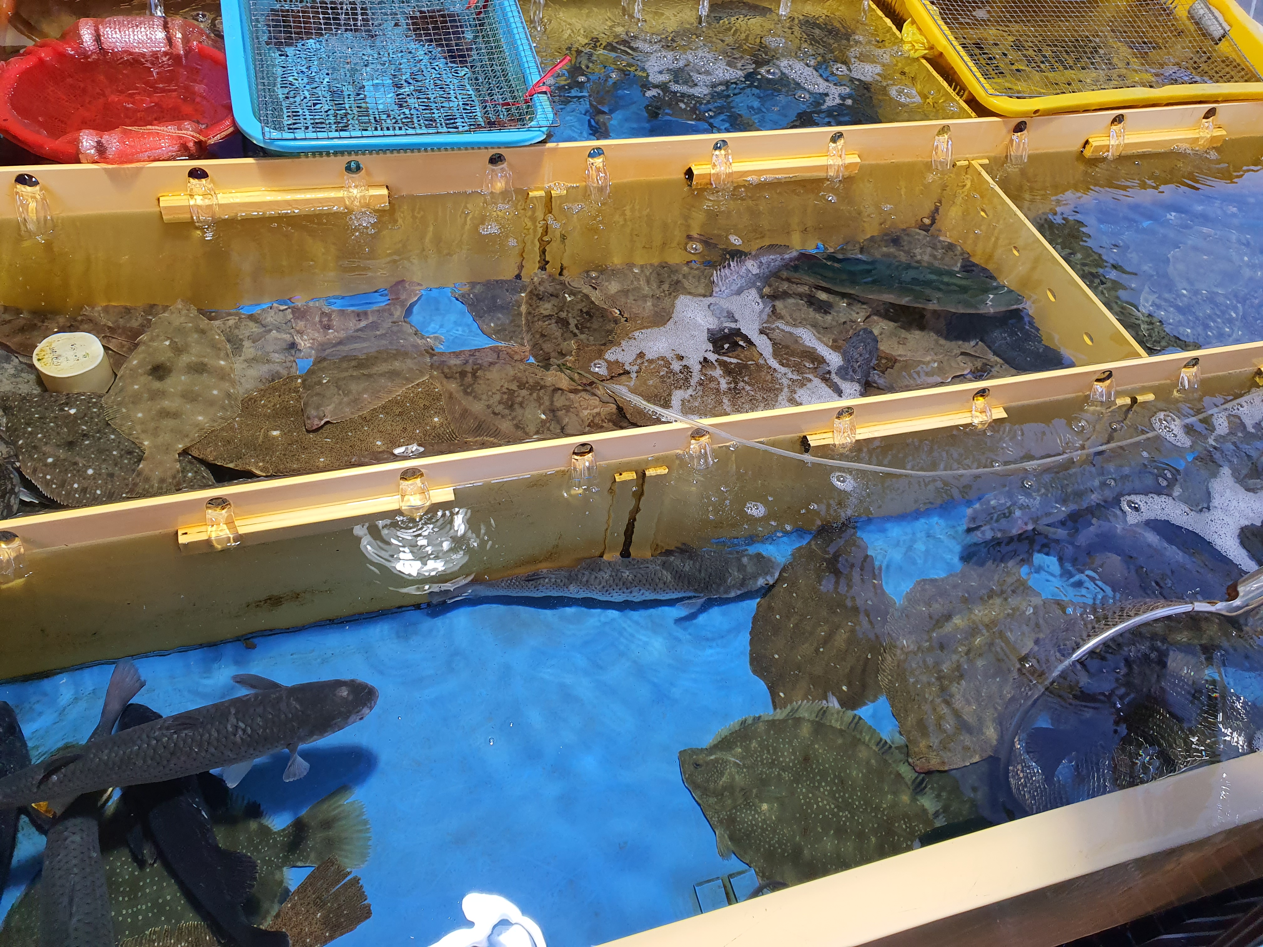 속초맛집 외옹치항 횟집에 들어가면 바로 수족관이 보이는데 그곳에서 일단 먹을 것을 정하고 들어 가면 되는데 좋은 것들로 간재미와 광어 쥐치회감 까지 골고루
