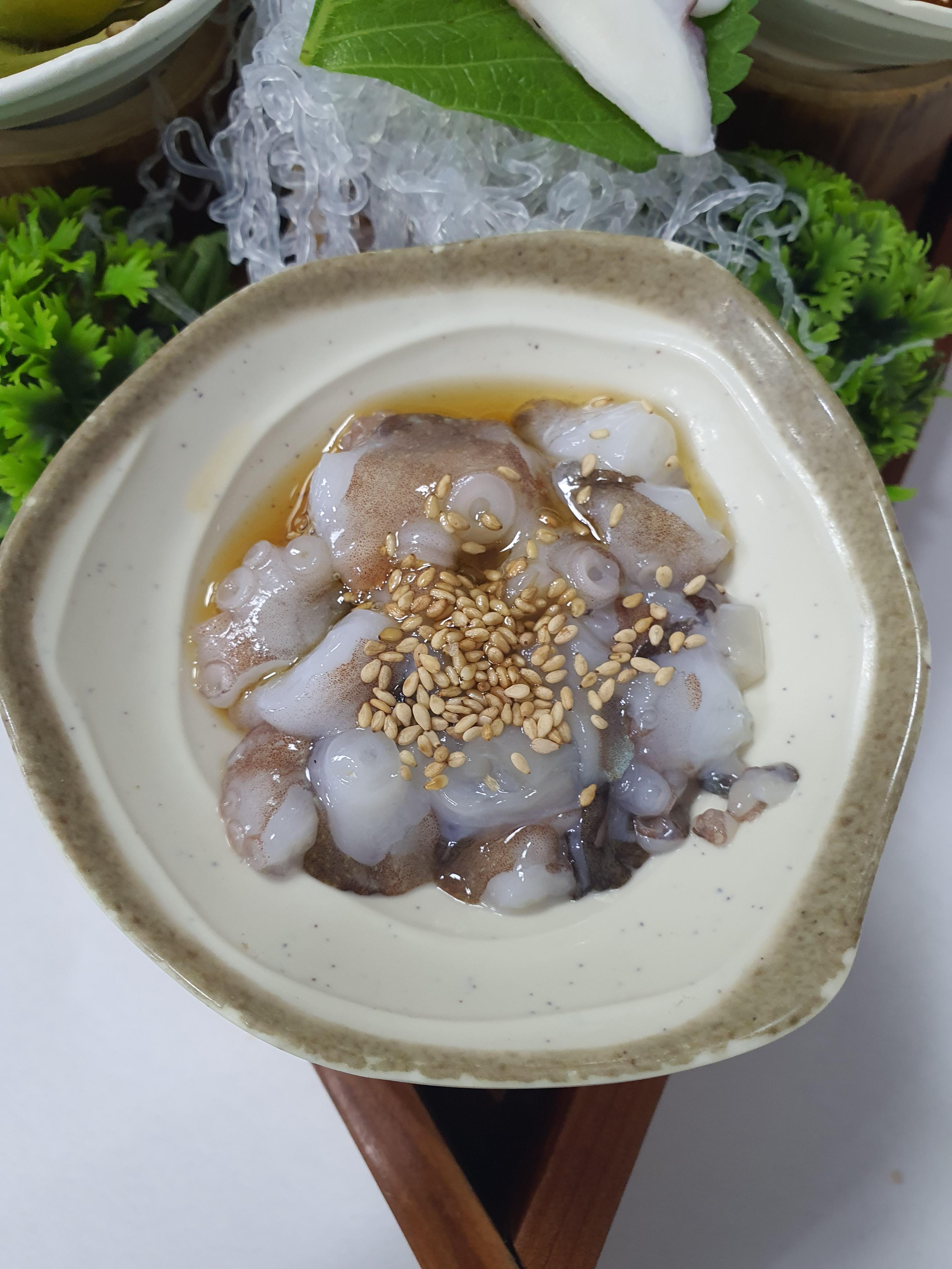 산낙지로 만든 탕탕이 참기름과 어울려져서 일품이며 내가 제일 좋아하는 것입니다