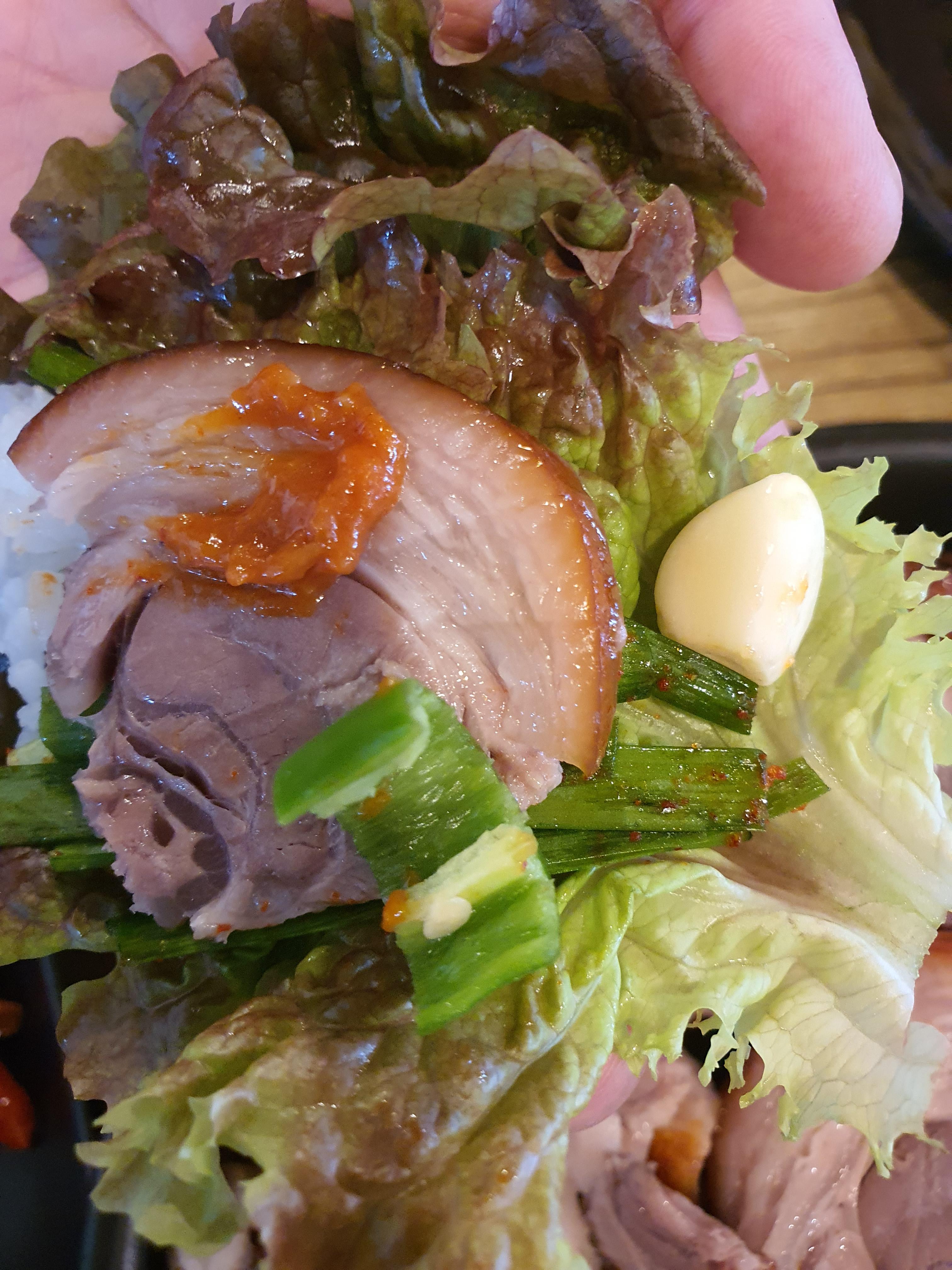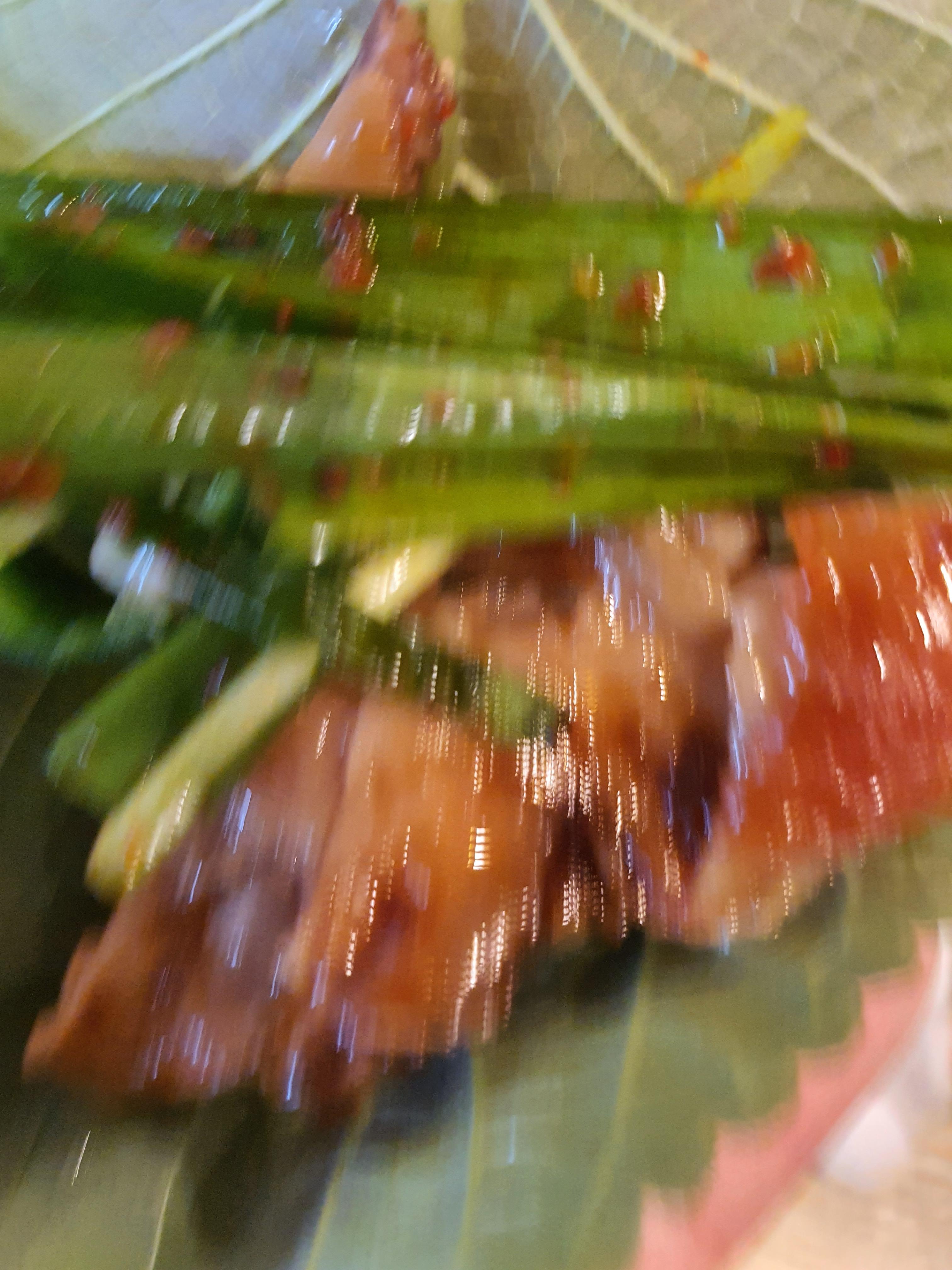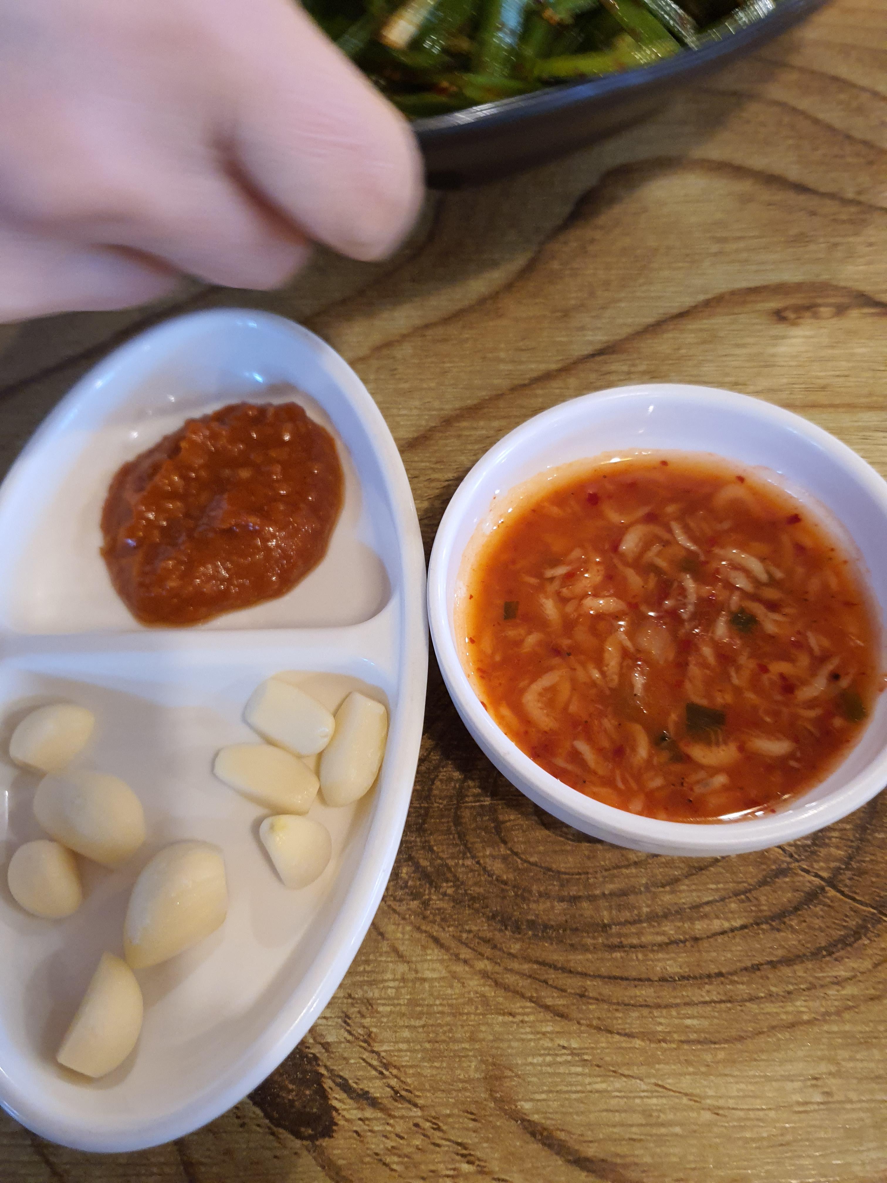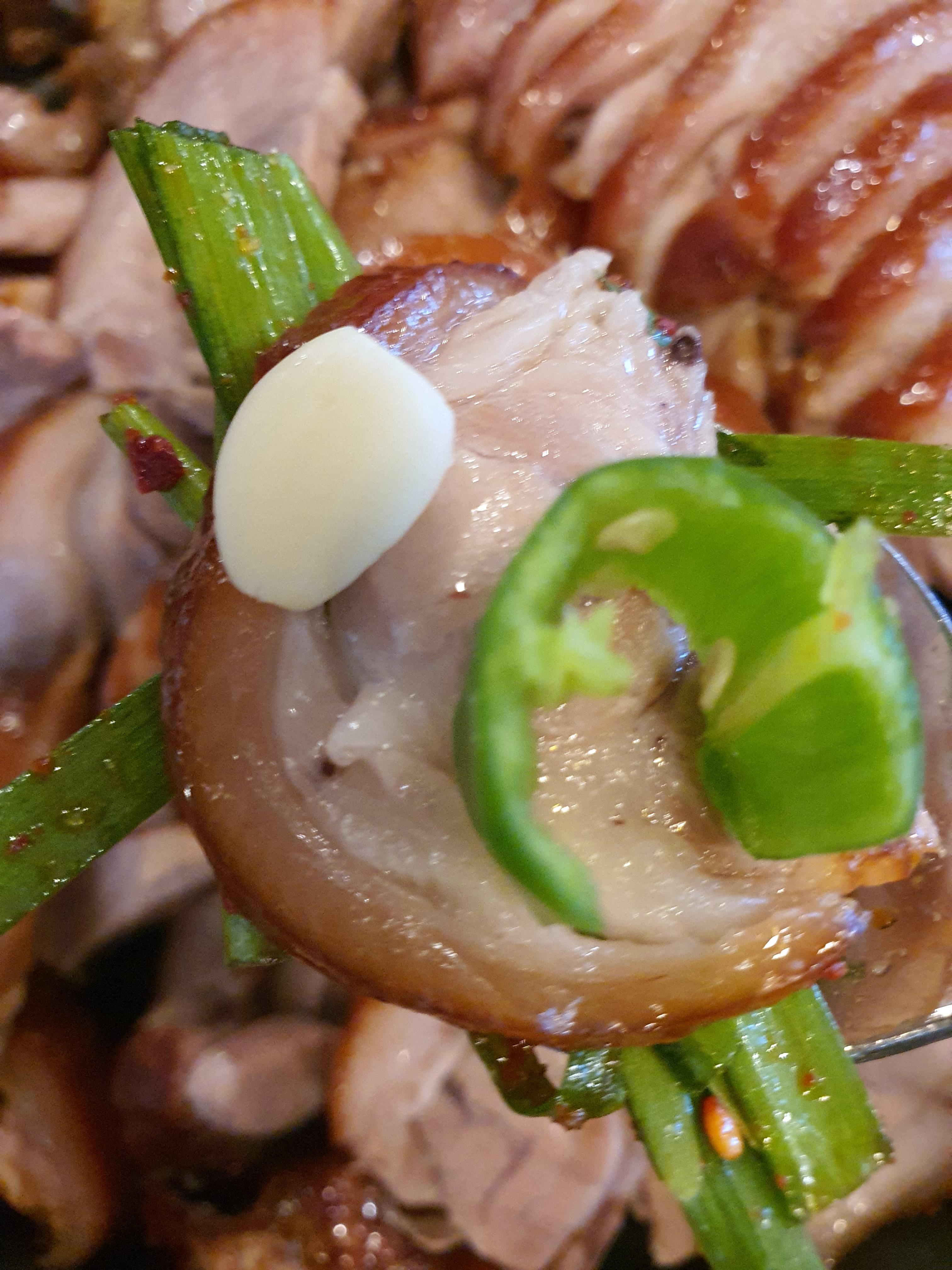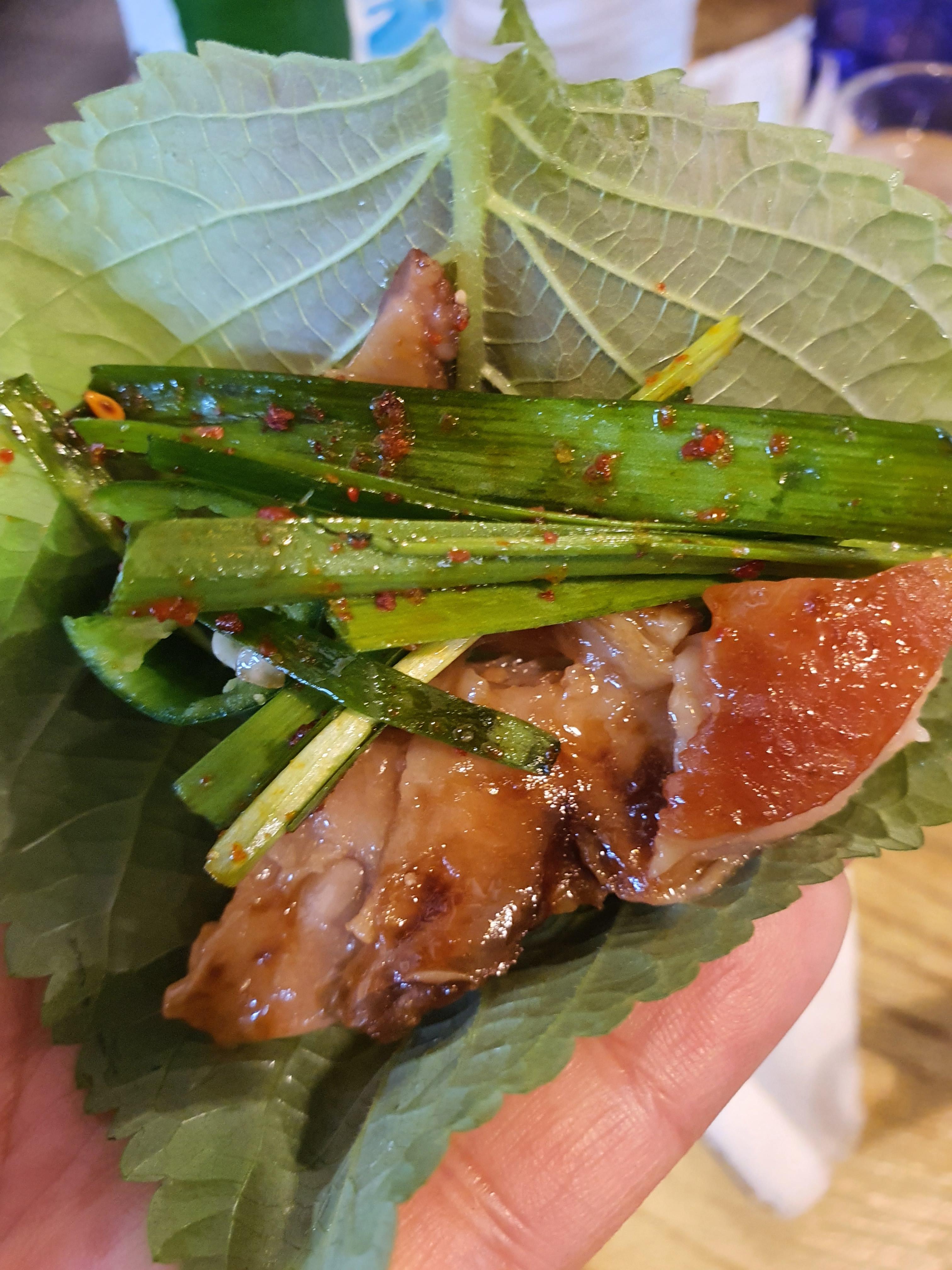 깻잎에 고기하나 올리고 부추와 고추 마늘까지 올려서 한쌈하면 환상적인 맛입니다