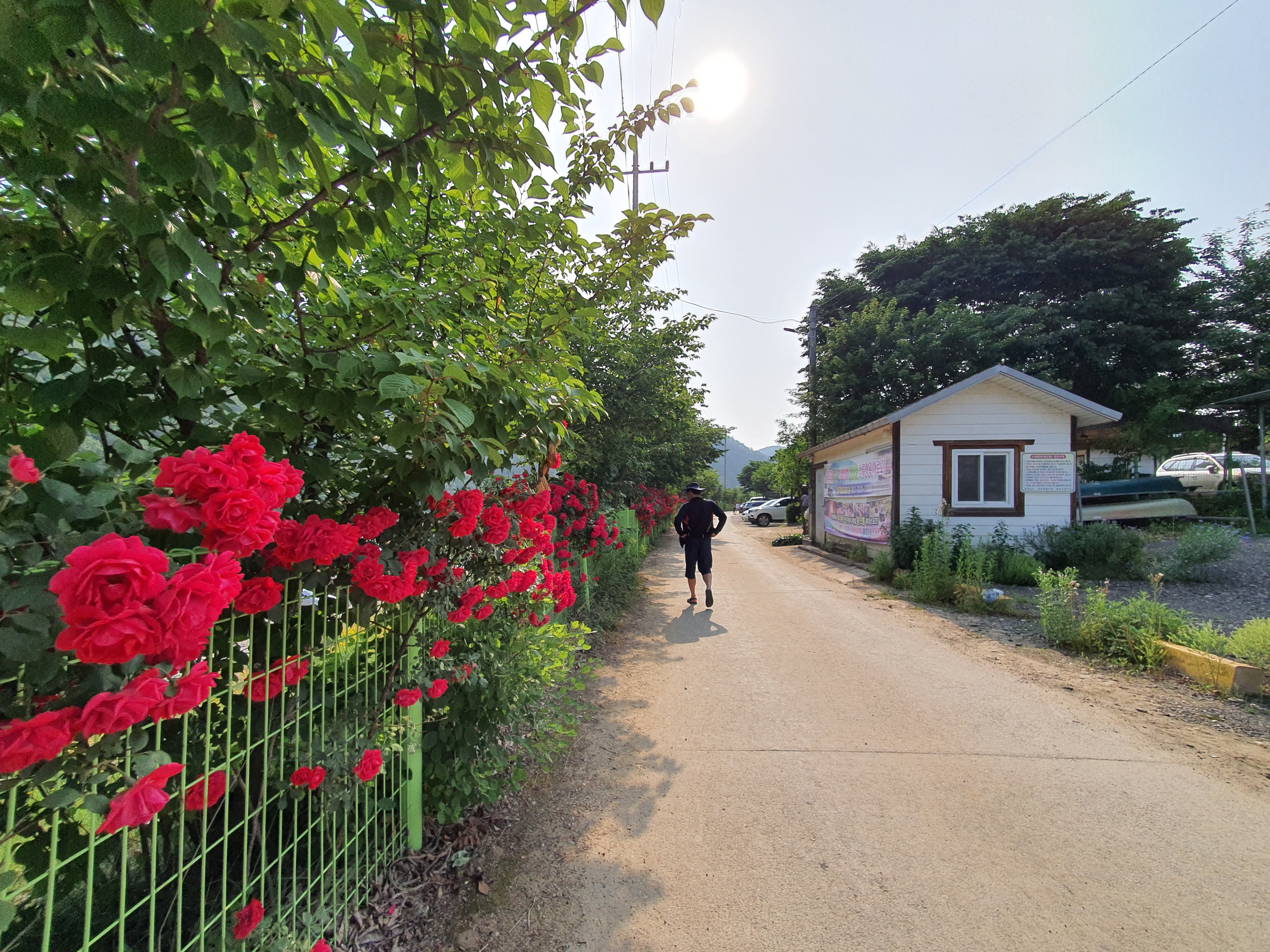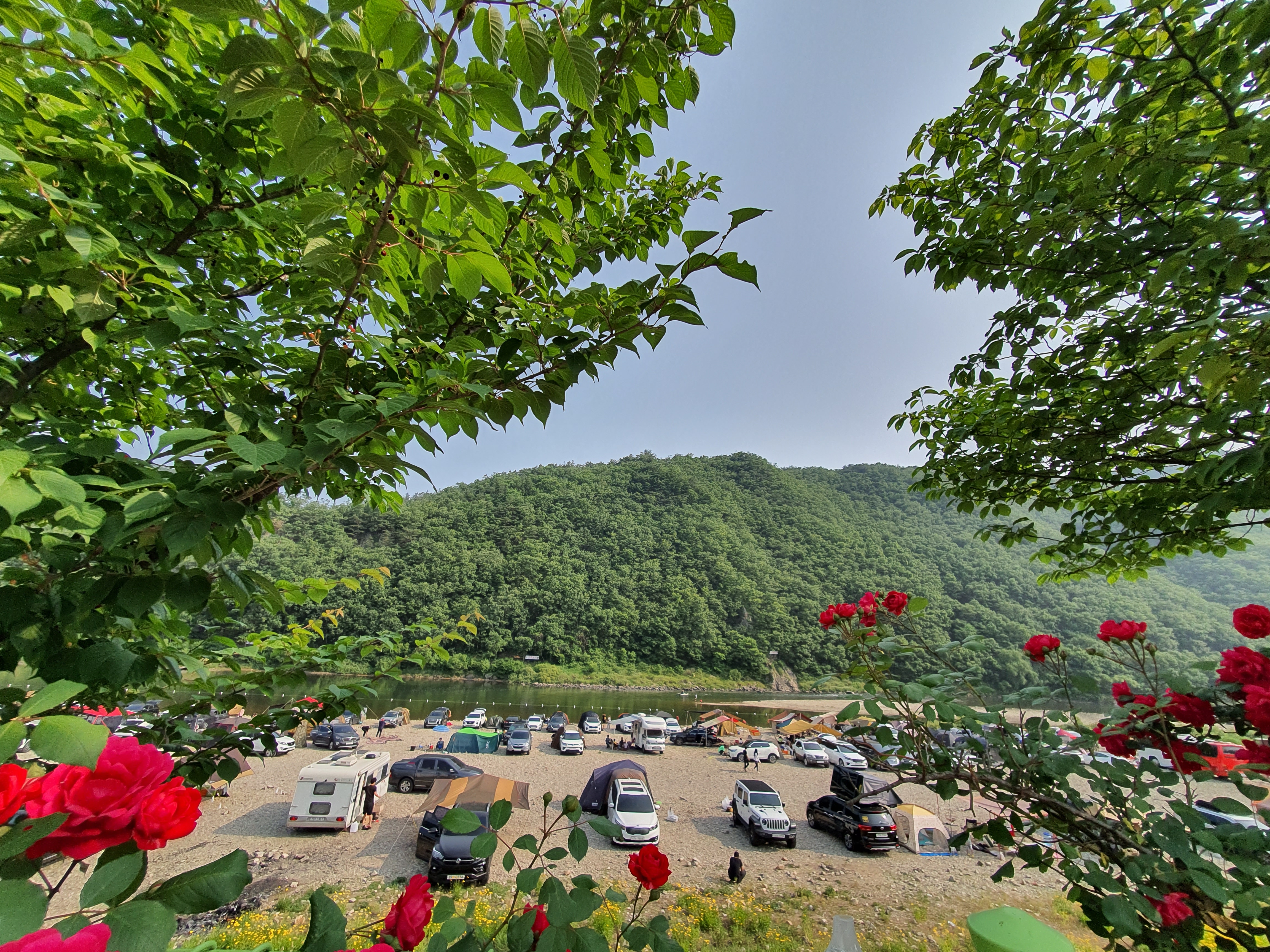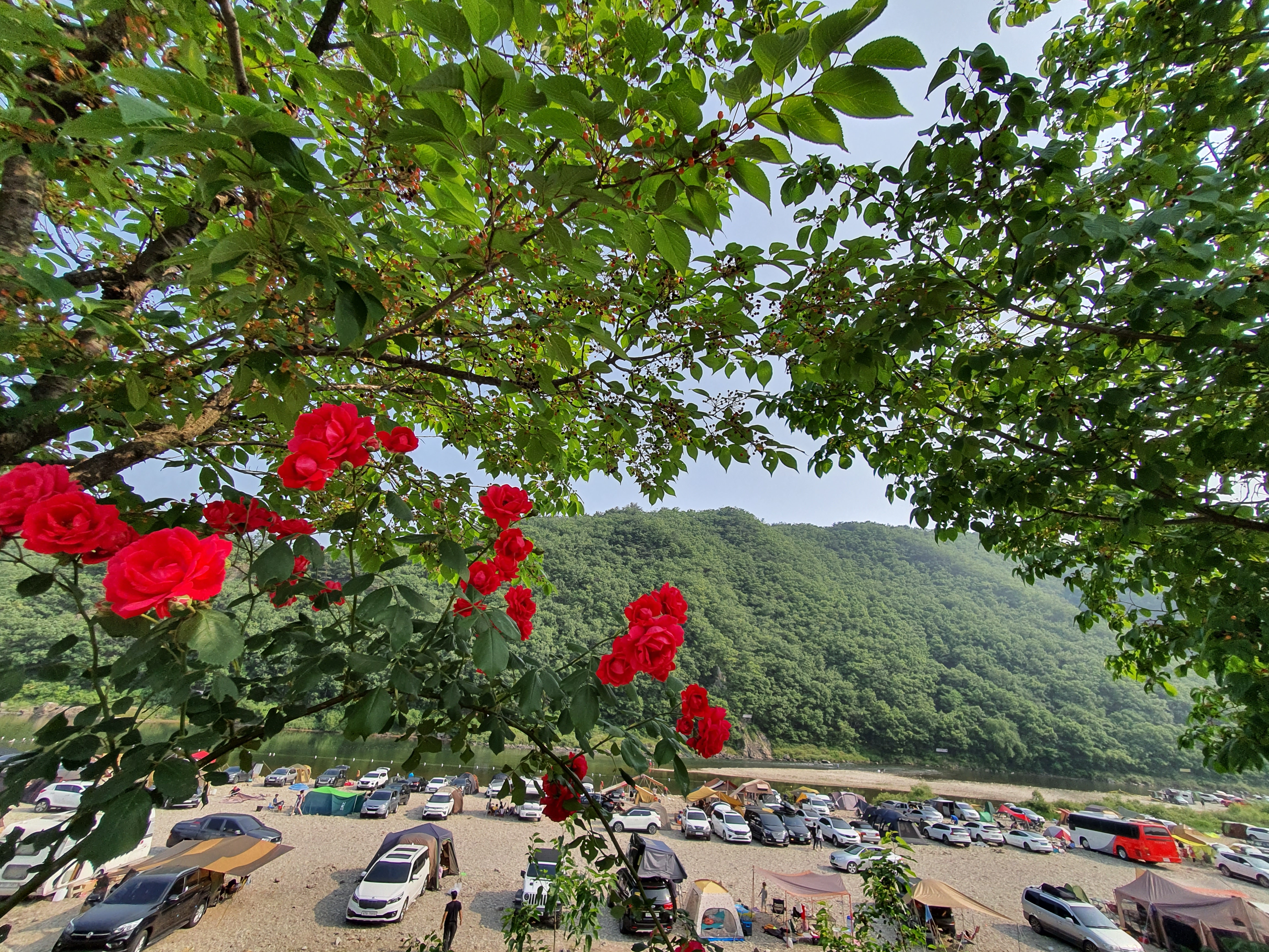 보리울 무료 캠핑장 장미꽃이 너무 화려하게 피어 있어서 느낌 있게 캠핑하는 차들과 함께 한컷 찍어 보니 아주 좋습니다
